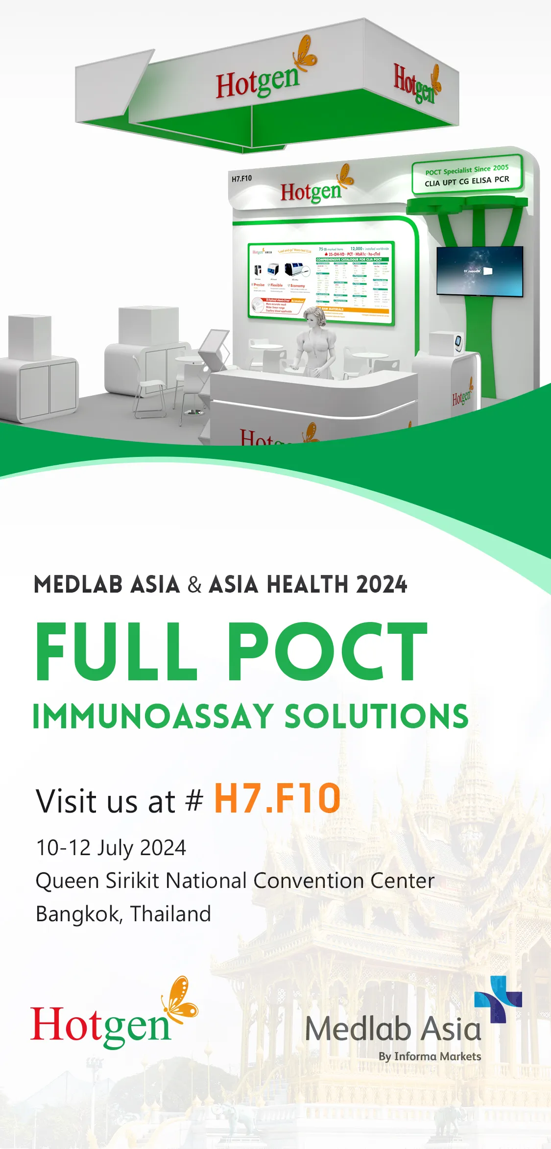 Hotgen Invites You to Meet in Bangkok and Explore Pioneering Diagnostic Solutions2024 Thailand International Medical Equipment and Supplies & Laboratory Exhibition (AISA HEALTH & MEDLAB ASIA) will be held on July 10th-12th, 2024, in Queen Sirikit National Convention Center, Bangkok, Thailand.Beijing Hotgen Biotech Co., Ltd. is proud to announce our participation in this esteemed event at booth H7.F10. During the event, we will present the well-recognized chemiluminescence (CLIA) and Up-Converting Phosphor Technology (UPT) immunoassay solutions, as well as our innovative small-molecule immonoassay technology. These offerings are poised to significantly enhance diagnostic capabilities across the Asian region.Holding the mission of "developing biotechnology, benefiting human health", Hotgen sincerely welcome all interested parties to visit our booth at H7.F10. Together, we can explore innovative IVD technologies, and deliver precise and convenient diagnostic solutions worldwide through joint collaborations.We are eagerly looking forward to meeting you at AISA HEALTH & MEDLAB ASIA in Bangkok, Thailand.