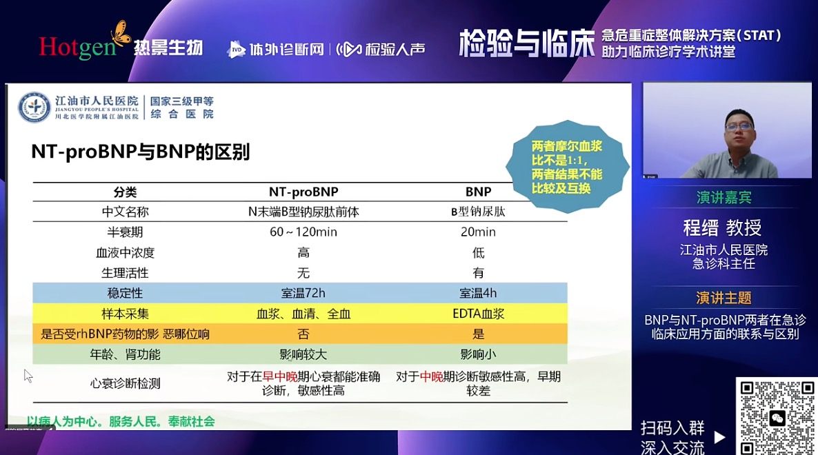 四川省江油市人民醫(yī)院急診科程縉教授就BNP與NT-proBNP兩個指標進行了深入剖析,從BNP與NT-proBNP病理生理機制出發(fā),解析了BNP和NT-proBNP之間的區(qū)別,全面的闡述了影響B(tài)NP和NT-proBNP水平的因素,又從檢驗角度強調(diào)BNP/NT-proBNP質(zhì)量要求和性能評價。最后程教授回歸臨床分享BNP/NT-proBNP在心衰早期篩查與一級預防、心衰的診斷與鑒別診斷和心衰治療監(jiān)測和預后評估等臨床價值。