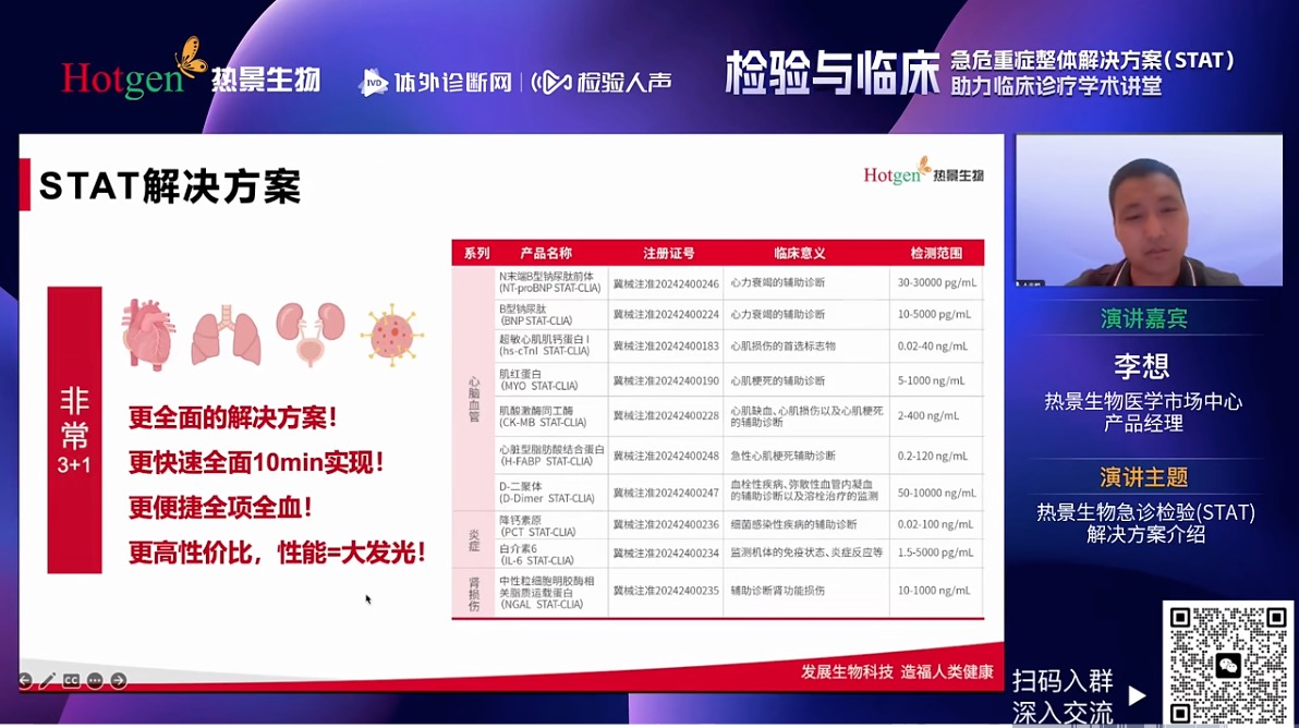 熱景生物醫(yī)學市場中心李想經(jīng)理根據(jù)臨床調(diào)研結果以及在急危重癥多樣化患者,分享熱景生物完整的急危重癥整體解決方案(STAT),并且分別闡述了不同場景匹配的解決方案,實現(xiàn)全血單人份10min準確報告出具,目前涵蓋心腦血管、炎癥以及腎損傷相關指標的全景解決方案,非常適用于胸痛中心、急診、ICU等臨床科室開展。