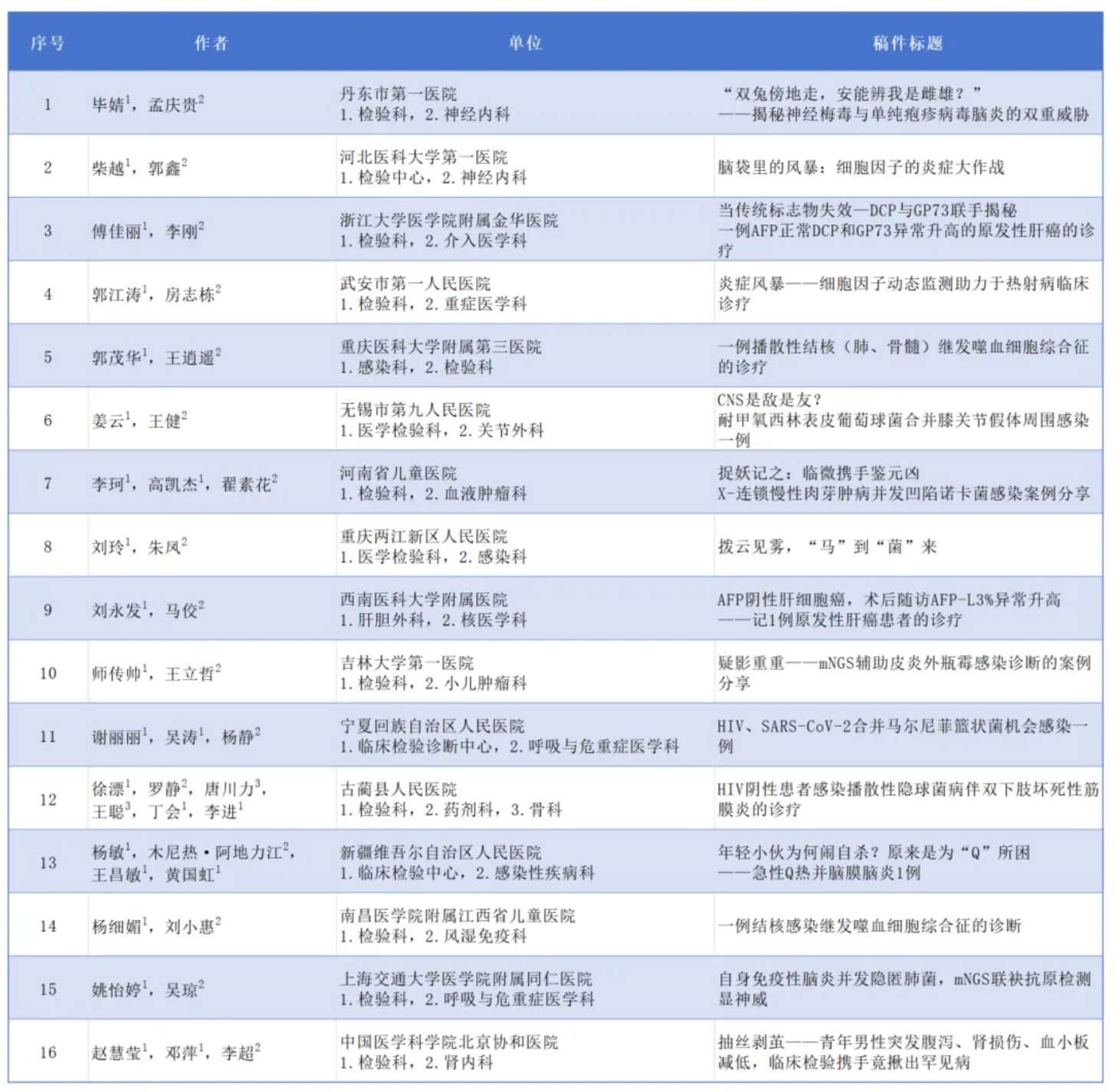 經(jīng)過2個多月的征稿、審稿、專家交叉審核,第四屆檢驗與臨床(感染性疾?。┧季S案例展示(推廣賽)決賽名單已經(jīng)出爐。
