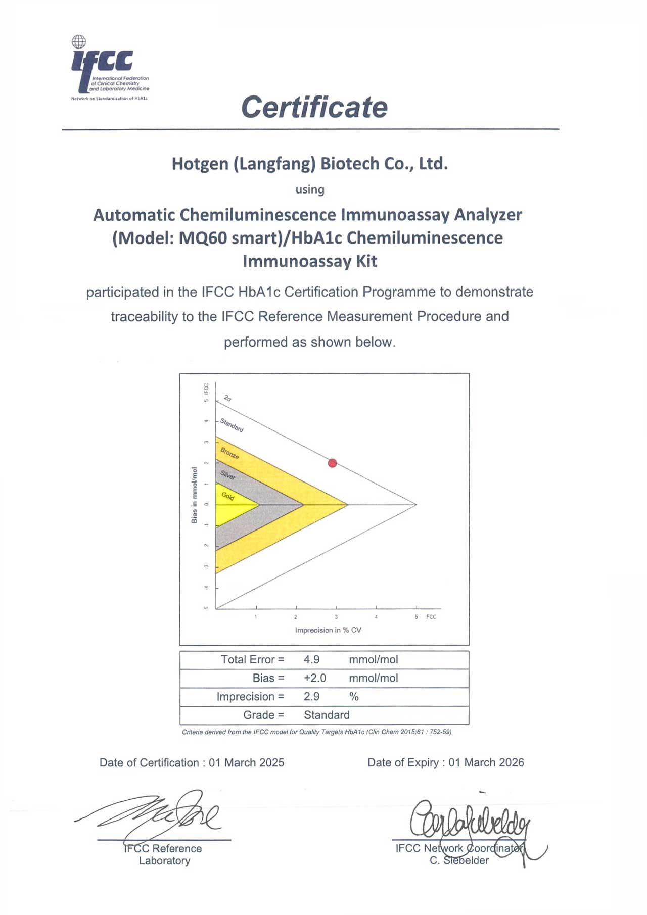 近日,熱景生物單人份化學(xué)發(fā)光免疫分析儀MQ60 Smart 檢測HbA1c獲得國際臨床化學(xué)與實驗室醫(yī)學(xué)聯(lián)合會(IFCC)的認證,確保了其檢測結(jié)果的標準化、規(guī)范化和國際化水平。同時意味著MQ60 Smart 檢測HbA1c的檢測結(jié)果具有國際認可的質(zhì)量和可靠性。