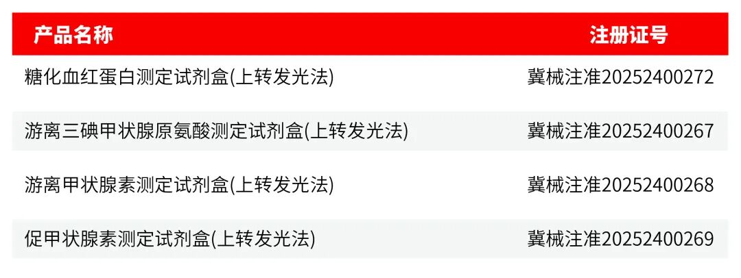 近日,熱景生物基于上轉(zhuǎn)發(fā)光(UPT)技術(shù)的 4 項(xiàng)醫(yī)療器械產(chǎn)品,成功拿下國(guó)家藥監(jiān)局《醫(yī)療器械注冊(cè)證》!此次獲批的甲功三項(xiàng)(FT3、FT4、TSH)與糖化血紅蛋白檢測(cè)項(xiàng)目,不僅是公司技術(shù)實(shí)力的權(quán)威認(rèn)證,更將為臨床診療與慢性病管理帶來(lái)便捷新選擇。